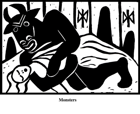 Monsters (2004) Monsters (2004). Block print. Monsters (2004). Block print. Appeared in Lorena Stookey (2004), ‘Thematic Guide to World Mythology’, Greenwood Press, Westport, Connecticut.
